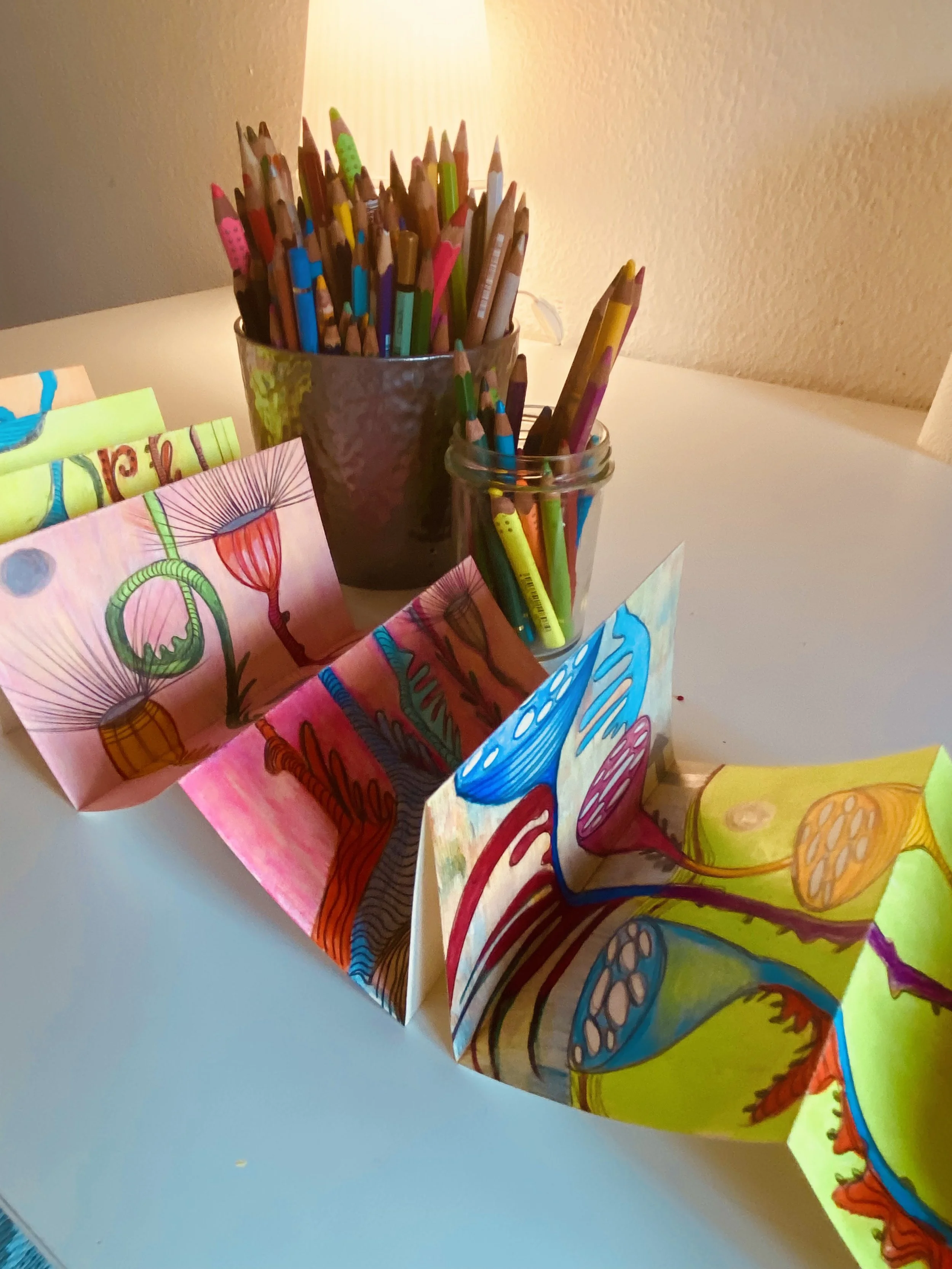 Leperellos fold up into a book and then expand out like a concertina. They can hang on a wall or be placed horizontally on a table or other object. They brighten a room and always add interest and colour. Here is a selection of a few concertina leperellos that I have done.